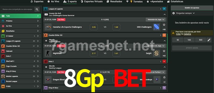 O 8Gp Bet oferece uma grande seleção de opções de apostas em e-sports com probabilidades competitivas
